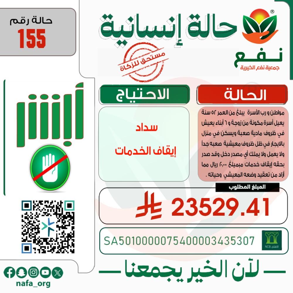 مواطن ورب لأسرة يبلغ من العمر ٥٢ سنة يعيل أسرة مكونة من زوجة و ٦ أبناء يعيش في ظروف مادية صعبة ويسكن في منزل بالإيجار في ظل ظروف معيشية صعبه جداً ولا يعمل ولا يملك أي مصدر دخل وقد صدر بحقه إيقاف خدمات بميلغ ٢٠,٠٠٠ ريال مما زاد من تعقيد وضعه المعيشي وحياته.