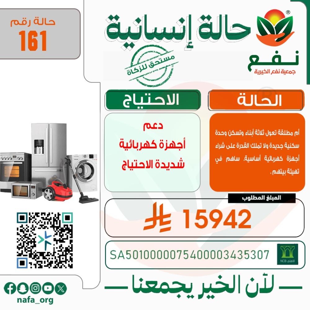 أم مطلقة تعول ثلاثة أبناء وتسكن وحدة سكنية جديدة ولا تملك القدرة على شراء أجهزة كهربائية أساسية. ساهم في تهيئة بيتهم.