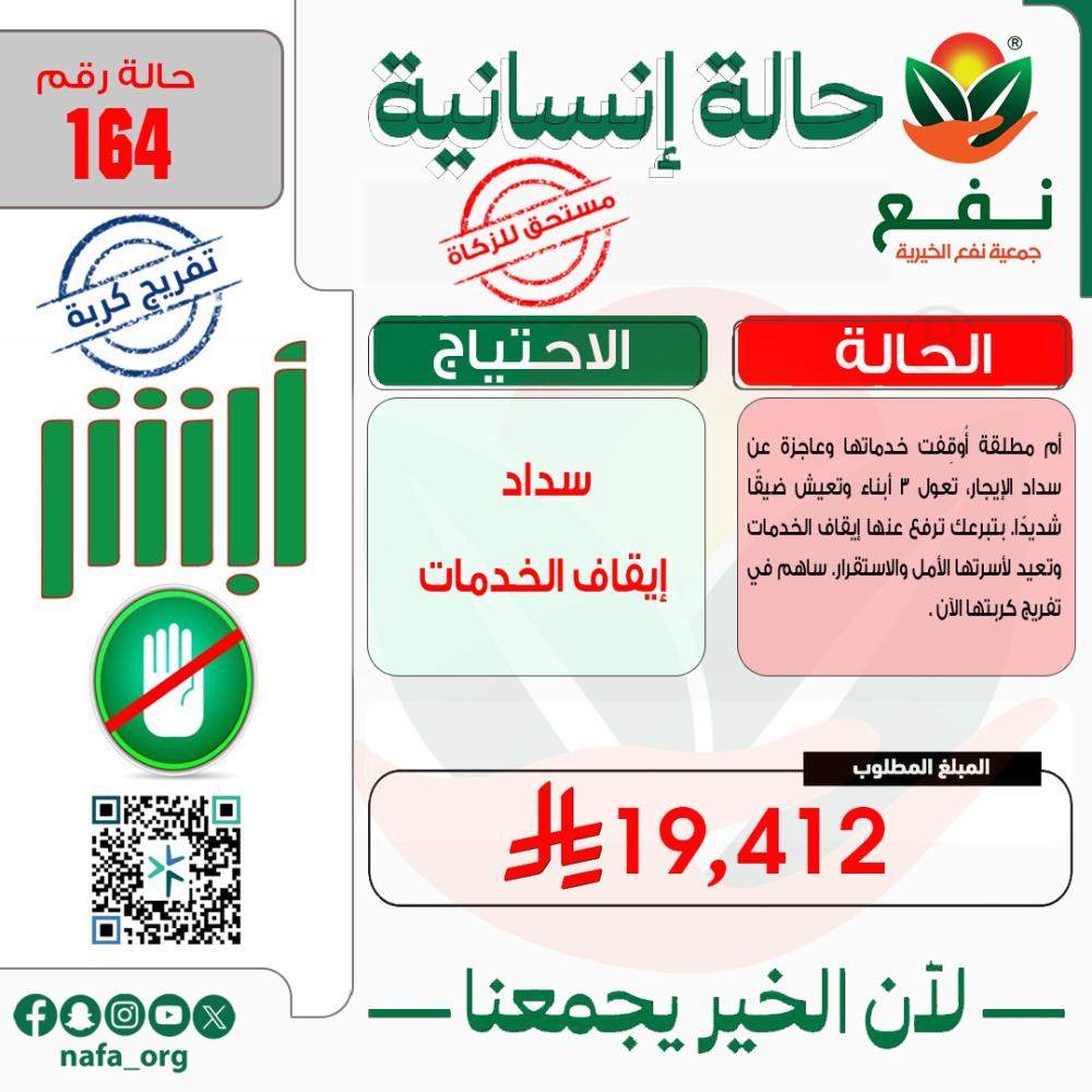 أم مطلقة أُوقِفت خدماتها وعاجزة عن سداد الإيجار، تعول 3 أبناء وتعيش ضيقًا شديدًا. بتبرعك ترفع عنها إيقاف الخدمات وتعيد لأسرتها الأمل والاستقرار. ساهم في تفريج كربتها الآن.